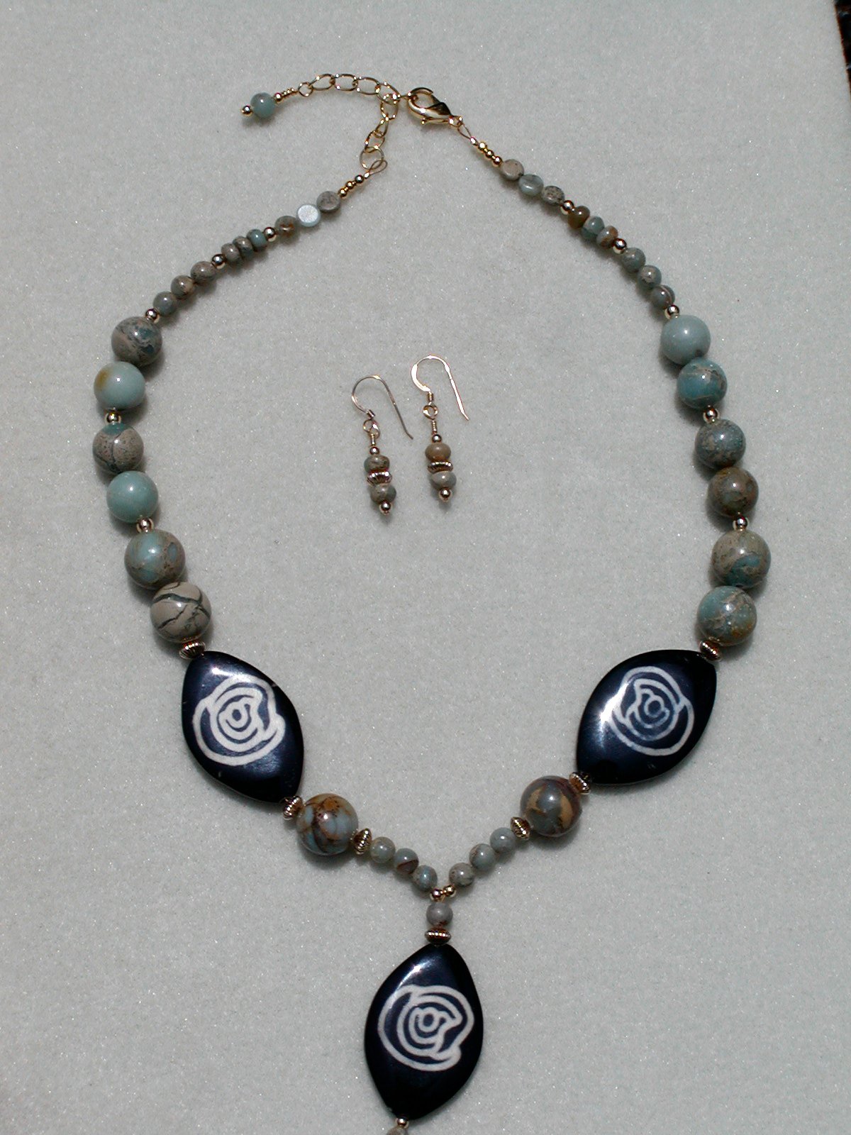Jasper Necklace and Earrings November 28, 2013January 3, 2016 by josh $ 90.00 This is a matching necklace and earring set made of jasper and agate beads accented by vermeil spacer beads. Lobster clasp. Earrings are small jasper beads with vermeil accents. Sold together or separately. Out of stock SKU: 002-004 Category: Necklaces Tags: earrings, jasper, necklace Related products Antique Gold Turquoise Patina Earrings $ 25.00 Add to cart Bronze Necklace and Earrings $ 65.00 Read more Pearl Cluster Earrings $ 25.00 Add to cart Blue Tigereye Necklace $ 65.00 Add to cart