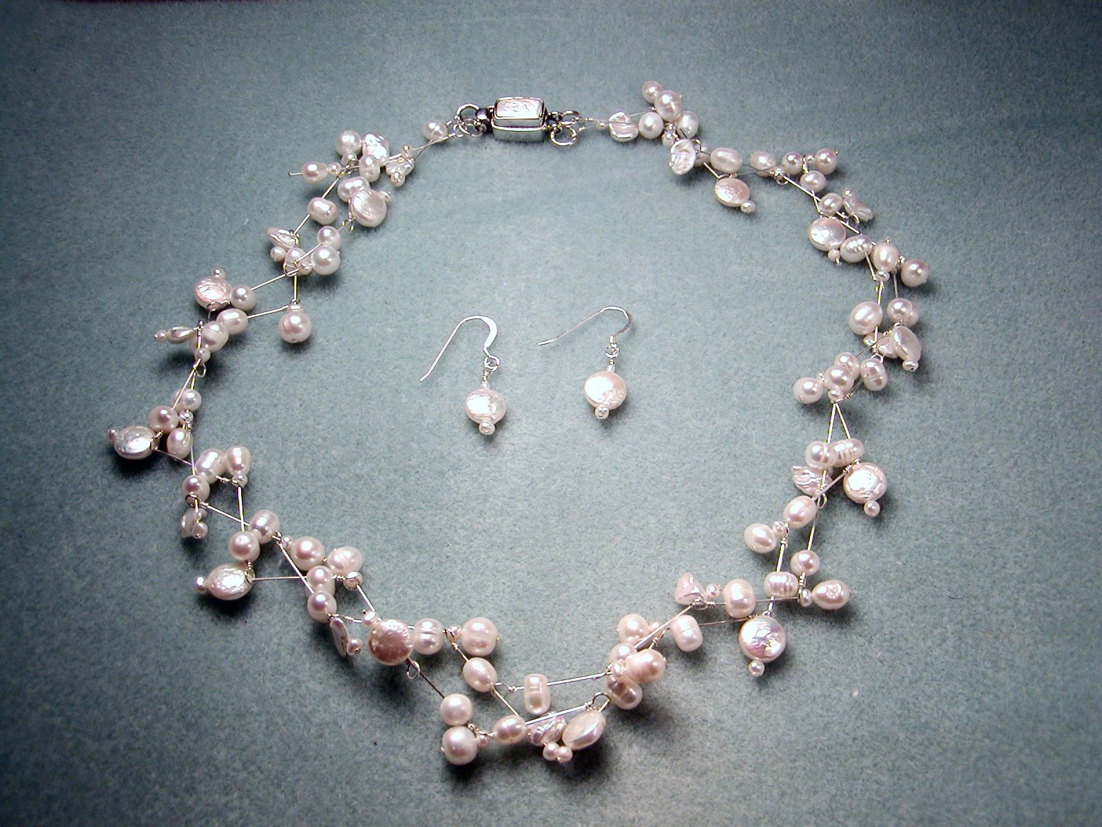 shapes of white freshwater pearls joined with sterling silver eye pins.